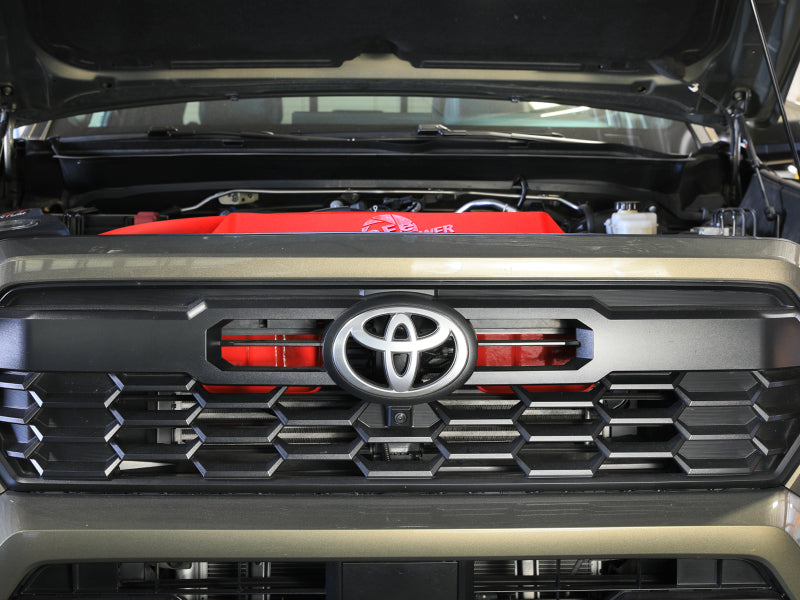 The aFe POWER D.A.S. XL doubles the inlet surface area compared to the factory scoop, significantly increasing the volume of incoming air. This optimized route minimizes heat soak and maximizes air density — crucial for high-performance applications. Constructed from Red XLPE (cross-linked polyethylene), the D.A.S. XL offers high resistance to heat, chemicals, and impact. This material choice not only ensures longevity under extreme engine bay conditions, but also provides structural strength that maintains airflow integrity over time. The Red Edition D.A.S. XL doesn’t just perform — it transforms the look of your engine bay. With its aggressive design, this scoop is a massive, high-impact piece that elevates the appearance of your truck. It’s a visual cue that performance lives under the hood. A dedicated spot is included to retain the Toyota coolant specification label for a clean, Factory-like look (label not included). The kit comes complete with all necessary components, including brackets to relocate the horns and a silicone cap to seal the side inlet of the aFe POWER Momentum GT air box, if desired.