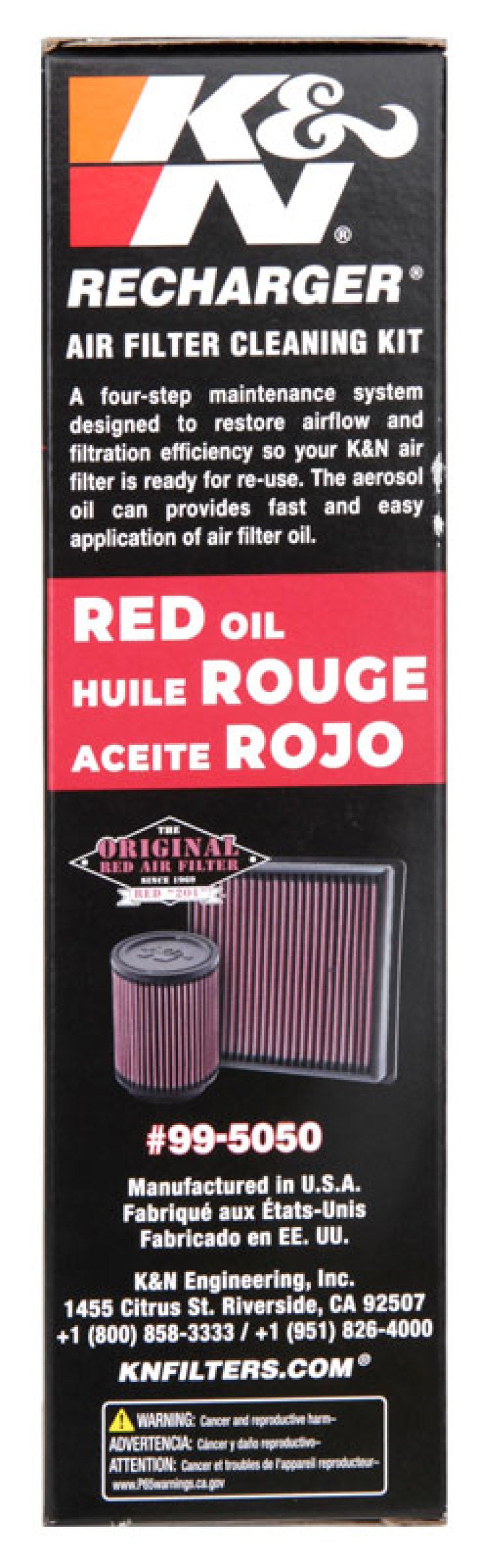 K&N Recharger Kit 99-5050 is designed for cleaning your K&N oiled cotton air filter when it is time to be serviced. The kit comes with K&N Power Kleen air filter cleaner and K&N air filter oil. 99-5050 will restore air flow efficiency and will bring your K&N oiled cotton air filter to like new condition. K&N Power Kleen works to dissolve the dirt build up and old filter oil, then it can be washed away with water. After the air filter fully dries re-oil your air filter then reinstall it. This Recharger Kit comes with an 8 ounce squeeze bottle of oil and a 12 ounce K&N pump bottle of Power Kleen air filter cleaner.