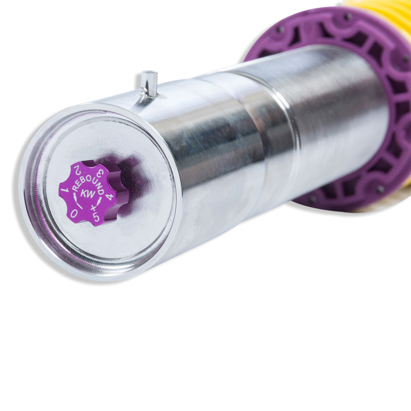 Cutting-edge motorsports technology for more performance on the road. Like every suspension product developed by KW automotive, the suspension manufacturer, and manufactured in Germany, the KW V3 Coilover suspension kit also provides a significant plus in safety reserves in road traffic. Thanks to the chassis with its high-quality dampers, springs, and elastomer spring elements, pitching and rolling movements during load changes such as evasive maneuvers, cornering, acceleration, and braking are significantly reduced. The braking distances are also shortened. Thanks to improved support and feedback, drivers not only feel safer but driving in everyday life becomes even safer. With compression and rebound stage damping, that can be set separately and independently of each other, the damper setup can be customized to your personal driving preferences or vehicle changes such as weight, tire characteristics, or altered vehicle rigidity. True perfo rmance optimization is only possible with this unique, patented system. For example, this allows the compression damping force to be increased and get more grip from the tires, to improve cornering behavior and reduce squat without simultaneously altering the rebound stage damping which is optimally matched to the spring rate, a scenario which results in reduced grip and the associated loss of performance. The KW V3 coilover kit is the ideal tool for performance-oriented drivers and experienced tuning enthusiasts who place a strong emphasis on the overall performance of their suspension. The Variant 3 features patented TVR-A and TVC-A technology that provides separately adjustable rebound and compression damping. The extensive adjustment range of the independently configurable rebound and compression make it easy to directly influence the steering behavior, directional stability, grip and handling characteristics for confident and repeatable results at the limit of driving dynamics.