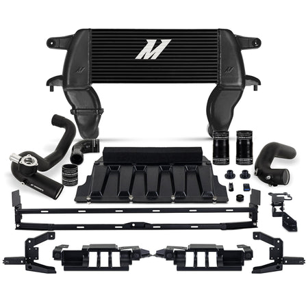 Unleash your 2021+ 2.3L EcoBoost Ford Bronco’s full potential with the Mishimoto High-Mount Intercooler Kit! Designed to allow your Bronco to breathe the coldest, densest air possible, this high-mount intercooler kit is comprised of our high-mount intercooler and performance intercooler pipe kit.----We’ve relocated the intercooler to the upper grille to allow better airflow at all times, even with winches, light bars, or larger bumpers installed. This location also helps protect the intercooler from obstacles on the trail. Our intercooler utilizes a 3.1 inch-thick bar-and-plate core that’s precision TIG welded to cast aluminum end tanks for superior durability and heat soak resistance. The weak plastic stock piping is replaced with high-flowing, durable aluminum piping and silicone boots with DuraCore technology. The larger volume of our pipes allows your 2.3L EcoBoost to breathe freely and make the most of its turbo, while the all-aluminum construction and DuraCore boots provide unmatched durability.----Durability is always a good thing, but it’s even better when it’s paired with performance. The high-mount intercooler boasts a 49-percent greater core volume and 93-percent greater external fin surface area than stock, which results in 21-degree cooler outlet temps over the stock intercooler. We also saw exceptional improvement in our trail simulation heat-soak testing where, after 6 back-to-back dyno runs, we still saw outlet temperatures 20-degrees cooler than stock.----This intercooler kit is available with a stealth black or sleek silver intercooler and micro-wrinkle black powder coated or polished pipes to match any style. Functionality of adaptive cruise control is retained utilizing a relocation bracket and 360-degrees cameras are unaffected. As with all our products, the Mishimoto 2021+ Ford Bronco 2.3L High-Mount Intercooler kit is backed by our signature Mishimoto Lifetime Warranty and comes with all necessary hardware for easy installation.